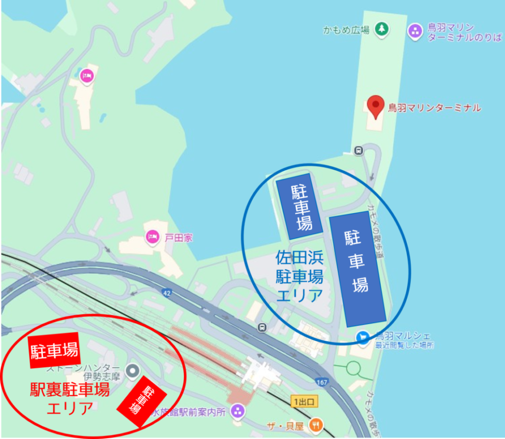 駐車場は「マリンターミナル付近にある佐田浜駐車場」と「鳥羽駅裏の駐車場」の二つの選択肢があります。